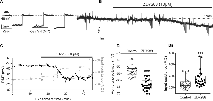 Figure 3. Ih Current Is Active at Rest and Contributes to the Intrinsic Properties of dINs(A) When dINs were held depolarized (∼−48 mV), hyperpolarizing pulses revealed a sag response around the original RMP.(B) Raw trace on a slow time base showing a clear membrane hyperpolarization of approximately 10 mV following the application of ZD7288 (10 μM). Blockade of Ih hyperpolarized all dINs.(C) Resting membrane potential (RMP) and input resistance plotted against experiment time for the experiment shown in (B). The hyperpolarization was accompanied by an increase in input resistance. Dashed line indicates the change of IR of the dIN in (B).(D) Pooled paired data showing that (Di) the membrane potential of dINs was significant hyperpolarized by ZD7288 (n = 23; p < 0.001; median with 50% IQR displayed as box-and-whisker plots). (Dii) Pooled paired data show a significant increase in input resistance in ZD7288 (n = 23; p < 0.001; median with 50% IQR displayed as box-and-whisker plots). ∗∗∗p < 0.001. See also Figure S2.