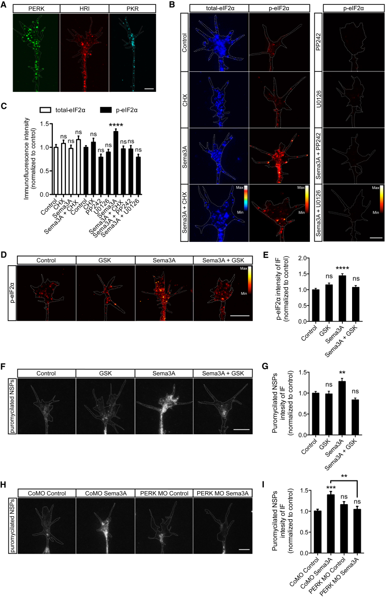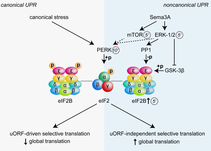 Local translation is rapidly regulated by extrinsic signals during neural wiring, but its control mechanisms remain elusive. Here we show that the extracellular cue Sema3A induces an initial burst in local translation that precisely controls phosphorylation of the translation initiation factor eIF2α via the unfolded protein response (UPR) kinase PERK. Strikingly, in contrast to canonical UPR signaling, Sema3A-induced eIF2α phosphorylation bypasses global translational repression and underlies an increase in local translation through differential activity of eIF2B mediated by protein phosphatase 1. Ultrasensitive proteomics analysis of axons reveals 75 proteins translationally controlled via the Sema3A-p-eIF2α pathway. These include proteostasis- and actin cytoskeleton-related proteins but not canonical stress markers. Finally, we show that PERK signaling is needed for directional axon migration and visual pathway development in vivo. Thus, our findings reveal a noncanonical eIF2 signaling pathway that controls selective changes in axon translation and is required for neural wiring.