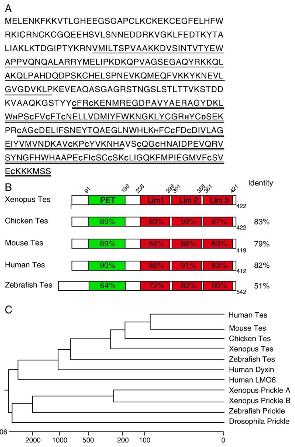 Fig. 1. Characterization of Xenopus Tes. (A) Amino acid sequence of Xtes with major domains highlighted. Underlined is the PET (Prickle, Espinas, Tes) domain.