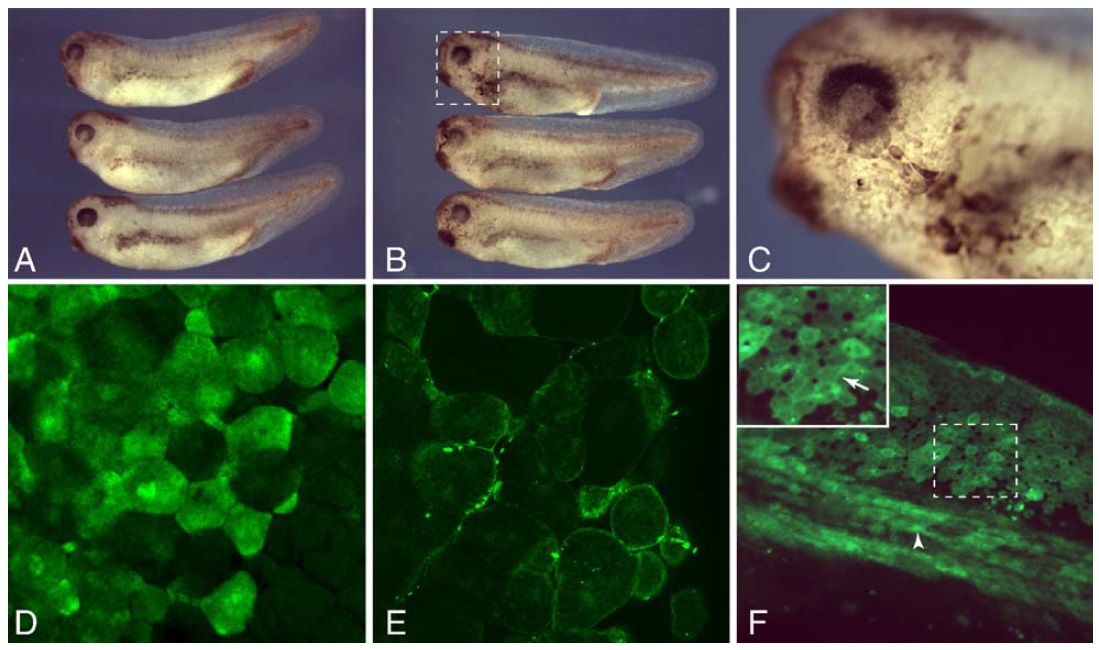 embryo (white dotted box in panel B) has been enlarged in panel C. (D, E) Expression and localization of GFP-Xtes. Embryos were injected with (D) GFP or (E, F)
