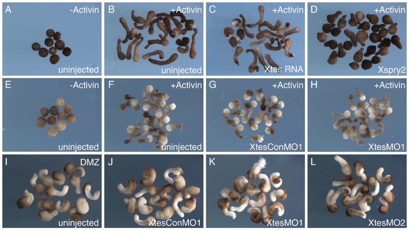 uninjected embryos are shown in panel E. (IâL) Xtes depletion does not inhibit convergent extension in dorsal marginal zone (DMZ) explants. DMZs were excised
