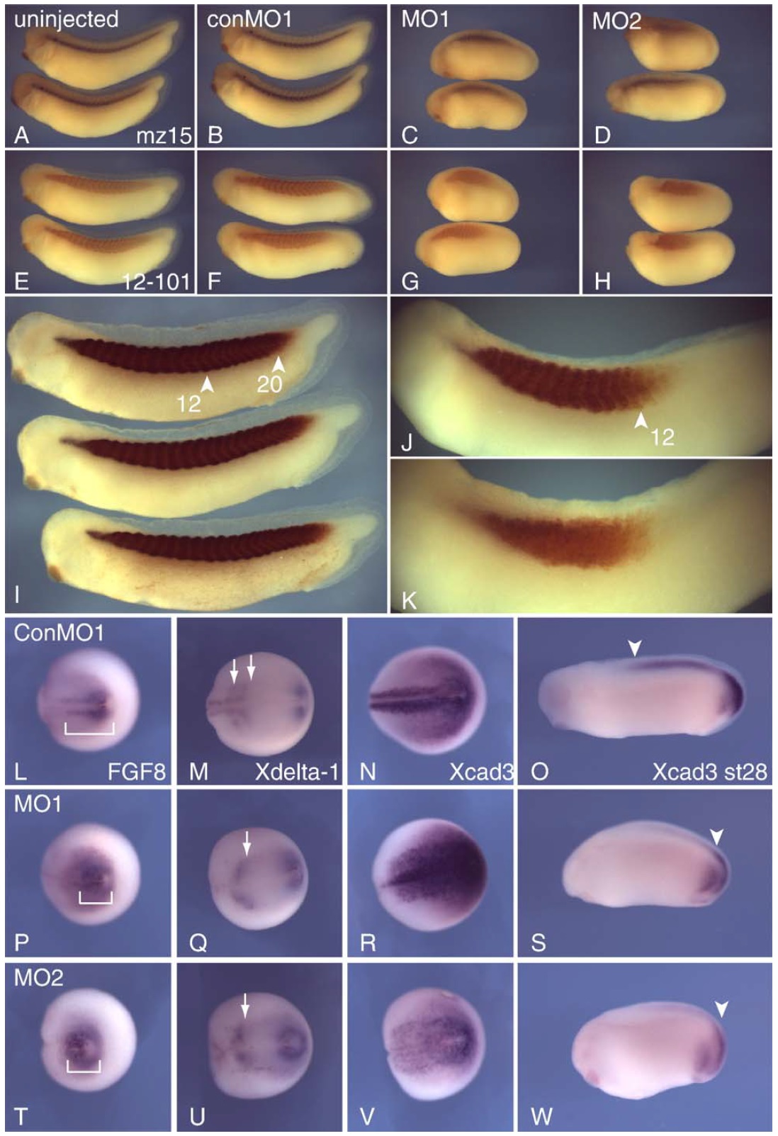 P, T) FGF8, (M, Q, U) Xdelta-1, (N, O, R, S, V, W) and Xcad3 were determined by in situ hybridization at (LâN, PâR, TâV) stage 20 in embryos injected at the 1 cell