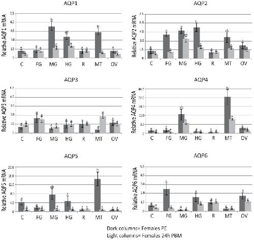 Figure 1. Aedes aegypti AQP expression in various parts of the alimentary canal.Expression was assayed using qPCR. The data represent relative quantification of Aedes AQPs which were normalized by qPCR analysis of ribosomal protein S7 (rpS7) mRNA levels in the cDNA samples. Values are means ± S.E. (error bars) of triplicate biological samples. The Y-axis shows expression ratios in arbitrary units with the lowest expressing tissue set as 1. Means separated by TukeyâKramer HSD (p < 0.05). Means which share the same letter are not significantly different. RNA was isolated from organs/body parts of adult female mosquitoes unfed (light shaded columns) and 24â hrs after a blood meal (dark shaded columns). C-crop, FG-foregut, MG-midgut, HG-hindgut, R-rectum, MT â Malpighian tubules, OV â ovaries.