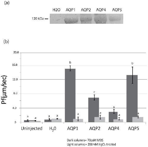laevis oocytes.(a) Day 3 post-injection with AQP cRNA, Western blot analyses of oocyte lysates using Myc-tag antibody (the AQP tetramer band is shown). The blots were cropped, and the full-length blots are presented in the supplementary information (see Supplementary Fig. S1). (b) Effect of heterologous expression of Aedes AQPs on water permeability of Xenopus oocytes. The light-shaded columns represent oocytes that were pre- treated with HgCl2. Each AQP group n = 9, and their mean separated by TukeyâKramer HSD (p < 0.05). Means which share the same letter are not significantly different.