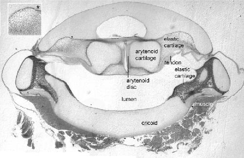 Figure 1âfigure supplement 1. The arytenoid discs are suspended in elastic cartilage.Transverse section (5 μm) through a decalcified, osmicated, epon-embedded larynx of a male X. laevis at the anterior-posterior level of the arytenoid discs (ad, Figure 1B inset); dorsal is up. As in X. borealis, (Yager, 1992) the anterior arytenoid cartilages and arytenoid discs are suspended in elastic tissue including elastic cartilage identifiable by its characteristic âSwiss-cheeseâ appearance (inset at left). Seams of elastic cartilage also insert bilaterally onto the cricoid box (cricoid), composed of hyaline cartilage, and form the septa between the lateral and medial chambers more posteriorly (illustrated in Figure 4C). Laryngeal muscle inserts via the tendon onto the arytenoid cartilages just posterior to the level of this section (see Figure 1B and inset). |