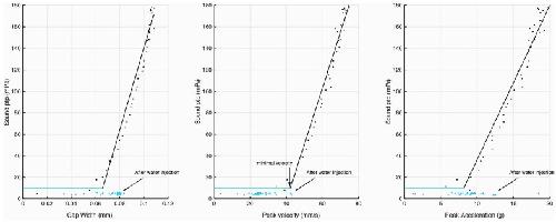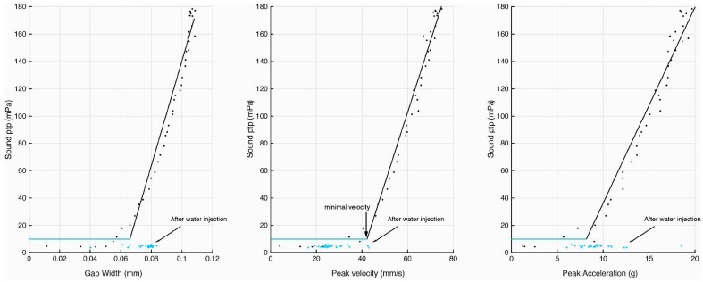 Figure 2—figure supplement 1. Injection of water into the supra-disc space via the glottis abolishes sound pulse production.Disc gap width, peak velocity and peak acceleration in relation to sound production before (black) and after (blue) water introduction. Following water injection, only disc velocity did not attain the minimal value associated with detection of sound pulses above the noise floor (as measured before water was injected). |