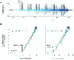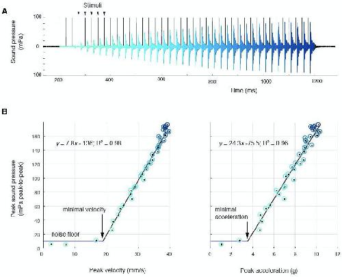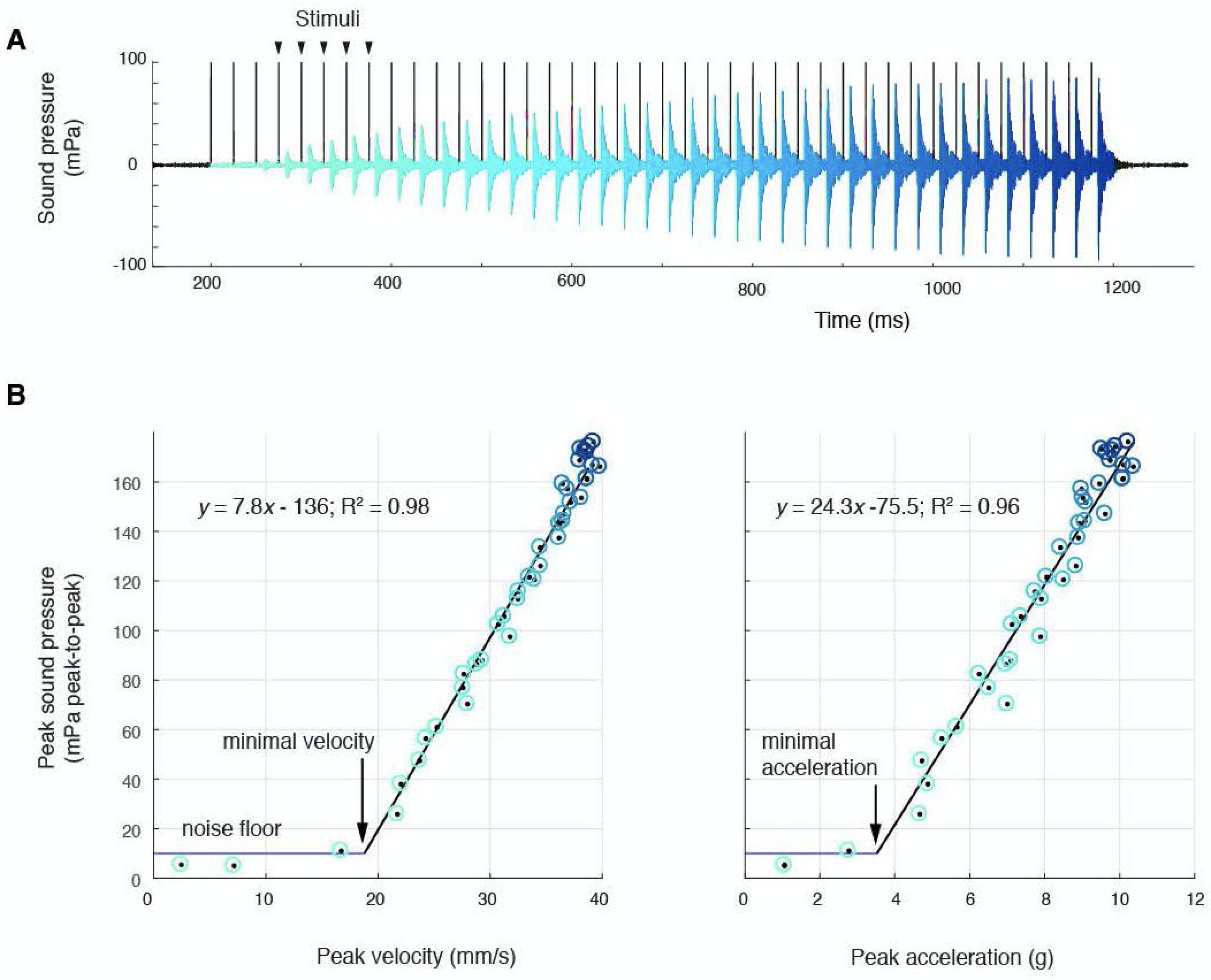 Figure 2. Sound amplitude correlates linearly with disc kinematics, (A) Sound pressure across 40 consecutive stimulations (black vertical lines) at 40 Hz (aqua, first stimulus; blue, last stimulus).(B) Peak sound pressure per stimulus (color-coded as in A) increases linearly with peak velocity (linear regression for three individuals: y = 5.2x-210.5, R2 = 0.96; y = 1.8x-35.1, R2 = 0.89; y = 7.8–136.3, R2 = 0.98) and peak acceleration (linear regression for three individuals: y = 14.3x-106.9, R2 = 0.91; y = 5.6x-6.1, R2 = 0.89; y = 24.3–75.5, R2 = 0.96). A minimal velocity and acceleration is required before sound is radiated |