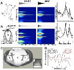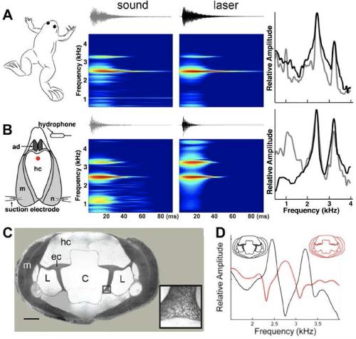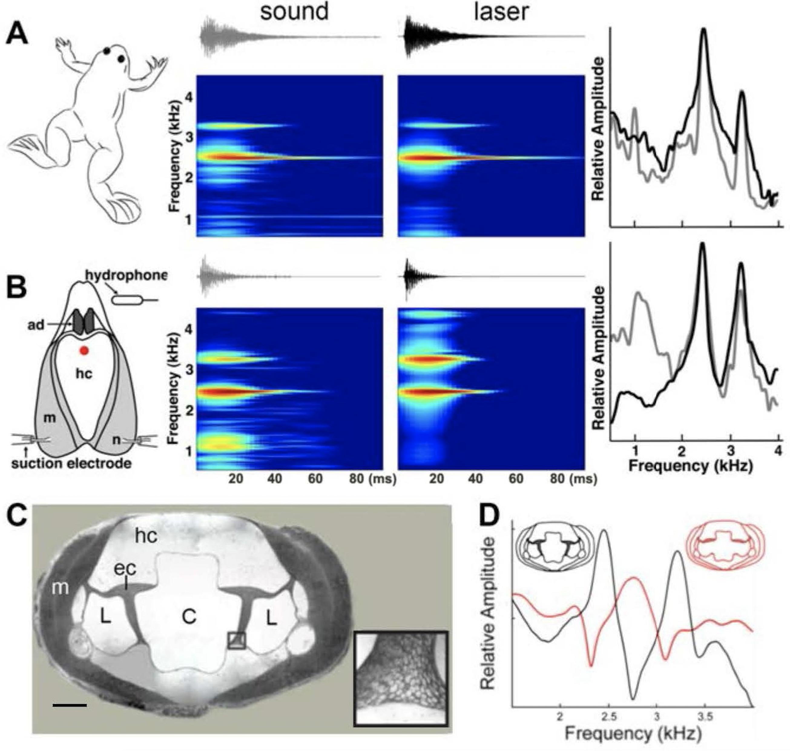 Figure 4. Harmonic dyad production is intrinsic to the isolated larynx and requires intact elastic cartilage septa.A singing male and an isolated larynx with intact elastic cartilage septa produce the same dyad in sound and laser recordings (A) Recordings from a X. boumbaensis male. Spectrograph (frequency vs time) of one pulse obtained from sound and laser vibrometry recordings. At right: Power spectra from the sound (grey) and laser (black) spectrographs. (B) Recordings from the isolated larynx of a X. boumbaensis male. Spectrograph (frequency vs time) of one pulse obtained from sound and laser vibrometry recordings, At right: Power spectra from the sound (grey) and laser (black) spectrographs. Note that the broad band frequency peak ~1 kHz in the sound recordings (gray) is not present in the laser recordings (black) and is thus an artifact of recording conditions (glass aquaria or Petri dish). Spectrographs are color graded to show increased intensity (blue to red). C - D Intact elastic cartilage is required for the production of frequency dyads. (C) Transverse section of an osmicated, epon-embedded male X. laevis larynx just anterior to the nerve (n) entry point in B; dorsal is up. The hyaline cartilage (hc) frame is flanked laterally by paired, bipennate laryngeal dilator muscles (m). Elastic cartilage sheets divide the lumen of the larynx into a central chamber (C) and two symmetrical lateral chambers (L). Elastic cartilage is recognizable by its unique, lace-like cellular morphology (inset). Scale bar 1 mm. (D) When elastic cartilage of the isolated larynx is disrupted bilaterally (red) via puncture (see Figure 1âfigure supplement 1), the two DFs characteristic of the intact larynx (in black) are replaced by a single, intermediate DF in red). |