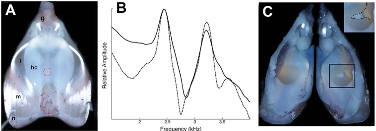 Figure 4âfigure supplement 1. Disruption of the elastic cartilage in an isolated larynx; the hole used to access arytenoid cartilages does not, by itself, disrupt dyads.(A) Dorsal surface of an isolated larynx from X. laevis. The placement of the hole through which elastic cartilage septa were accessed is indicated by the dashed red circle. hc = hyaline cartilage, m = muscle, n = nerve, t = tendon, g = glottis. (B) Dyad frequencies before (solid line) and after (dashed line) creation of the hole. (C) Interior of a larynx after puncture of the elastic cartilage (right side; see inset). The elastic cartilage presents a yellowish appearance. |