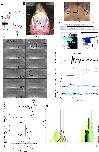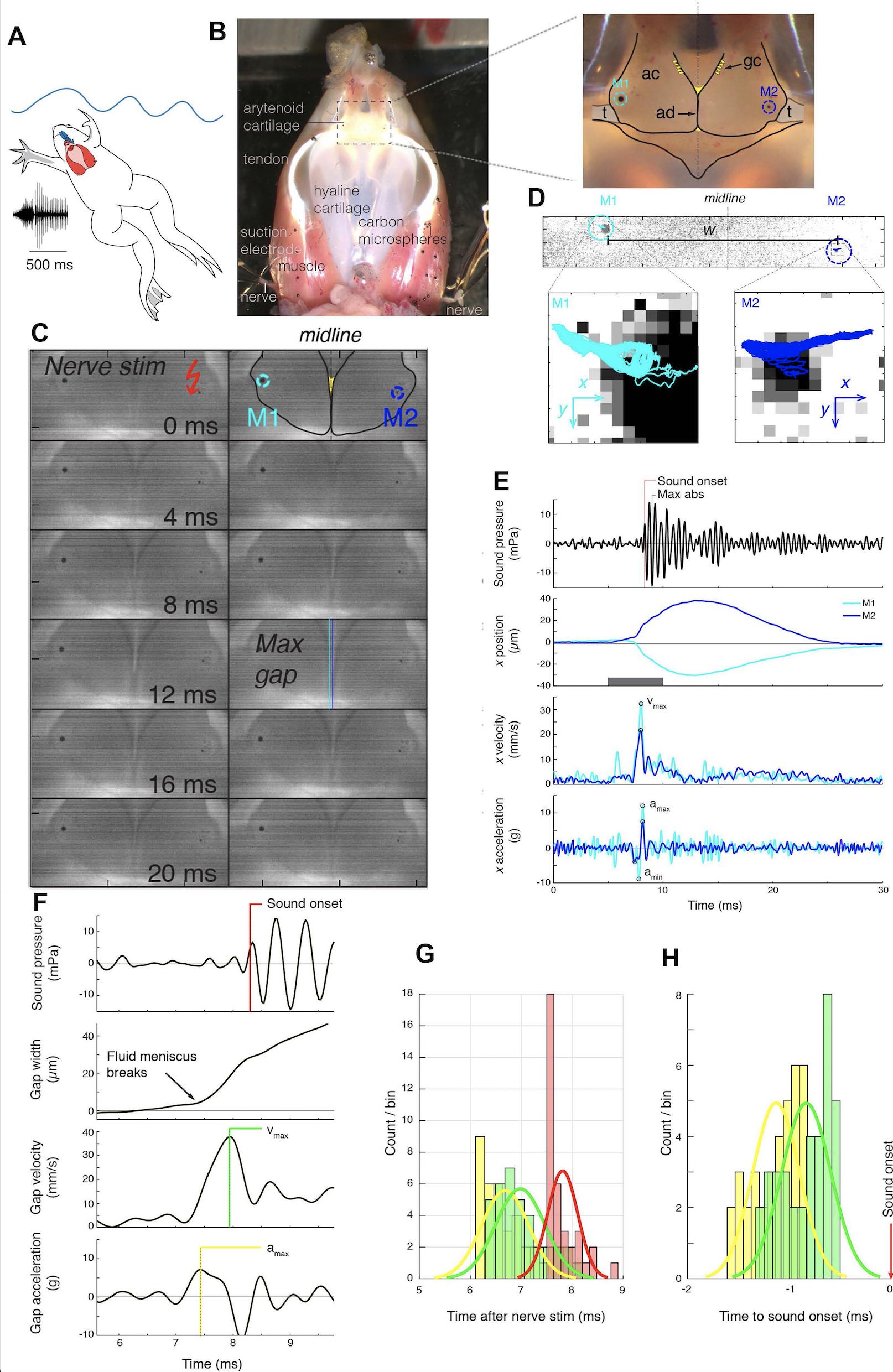 Figure 1. Arytenoid disc kinematics associated with underwater sound production in the ex vivo larynx of Xenopus laevis.(A) Xenopus call while submerged. A ventral view of a reproductively active, X. laevis male (nuptial pads in grey on the inner surface of the forearms), underwater (blue waves); larynx in red and more dorsal brain in blue. This view of the larynx is schematic (i.e. the dorsal rather than the ventral side is illustrated) in order to correspond to the actual isolated larynx in (B). On the left, an oscillogram (sound intensity vs time) of a single, biphasic call that includes a fast and slow trill. Each vertical line indicates a sound pulse; ~60 pulses/s for fast trill and ~30 pulses/s for slow trill. (B) Dorsal aspect of an isolated X. laevis larynx, a cricoid box of hyaline cartilage flanked by muscles. Each effective contraction/relaxation of these paired laryngeal muscles produces a single sound pulse. In the preparation illustrated, sound pulses are evoked by electrical stimulation of both laryngeal nerves via suction electrodes. Inset: Each muscle contraction produces a transient increase in tension on the arytenoid discs (ad) located within the arytenoid cartilages (ac) via the tendons (t). Globule cells (gc) secrete a mucopolysaccharide onto the medial surfaces of the arytenoid discs (Yager, 1992). Carbon microspheres (e.g. M1 and M2) placed on the surface of the larynx track muscle and cartilage positions. (C) Still photo of arytenoid cartilage motion filmed at 10,000 fps and illustrated at 2 ms intervals. Nerve stimulation occurs in top left image. (D) Upper panel: Higher magnification images of each bead in B) during filming at 44,000 fps. Lower panel: The small motion of each bead (cyan, left; blue, right) during 40 consecutive stimulations at 40 Hz. (E) Sound (top panel, corrected for time of flight) and the position, velocity and acceleration of the two beads (color coded as in D) during a single pulse. Nerve stimulation occurs at t = 0. (F) Kinematic data for gap width (w) in C) in relation to sound onset. While the precise onset (red line) is hard to determine due to acoustic noise, sound production follows peak velocity (green) or acceleration (yellow). (G) The timing of sound onset (red), gap peak acceleration (yellow) and peak velocity (green) during 40 consecutive clicks for one larynx relative to nerve stimulation. (H) Sound onset relative to gap peak acceleration (yellow) and peak velocity (green) during 40 consecutive clicks for the larynx in G). |