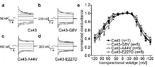 Elenes, Heterotypic docking of Cx43 and Cx45 connexons blocks fast voltage gating of Cx43. 2001, Pubmed