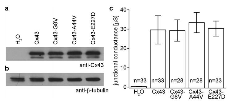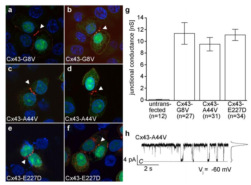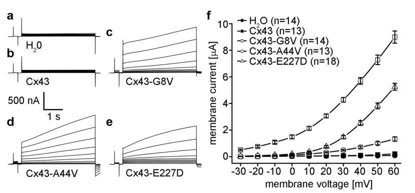 Mutations in the gene (GJA1) encoding connexin43 (Cx43) are responsible for several rare genetic disorders, including non-syndromic skin-limited diseases. Here we used two different functional expression systems to characterize three Cx43 mutations linked to palmoplantar keratoderma and congenital alopecia-1, erythrokeratodermia variabilis et progressiva, or inflammatory linear verrucous epidermal nevus. In HeLa cells and Xenopus oocytes, we show that Cx43-G8V, Cx43-A44V and Cx43-E227D all formed functional gap junction channels with the same efficiency as wild-type Cx43, with normal voltage gating and a unitary conductance of ~110 pS. In HeLa cells, all three mutations also localized to regions of cell-cell contact and displayed a punctate staining pattern. In addition, we show that Cx43-G8V, Cx43-A44V and Cx43-E227D significantly increase membrane current flow through formation of active hemichannels, a novel activity that was not displayed by wild-type Cx43. The increased membrane current was inhibited by either 2 mM calcium, or 5 µM gadolinium, mediated by hemichannels with a unitary conductance of ~250 pS, and was not due to elevated mutant protein expression. The three Cx43 mutations all showed the same gain of function activity, suggesting that augmented hemichannel activity could play a role in skin-limited diseases caused by human Cx43 mutations.