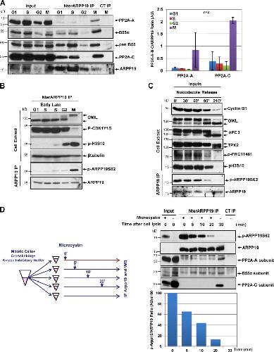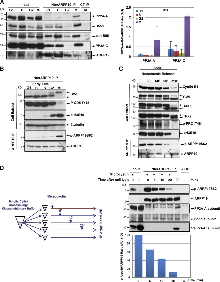 Figure 1. ARPP19 is functional in human cells. (A) Synchronized HeLa cells were lysed in the presence of a reversible cross-linker and used for immunoprecipitation (IP), using anti-NterARPP19 or anti-GST (control [CT]) antibodies. PP2A-B55 subunits and ARPP19 were checked in inputs and immunoprecipitates (IP). The levels of PP2A subunits A and C in the IPs were quantified using ImageJ software, normalized to the total levels of ARPP19, and represented. Values (mean ± SD) are from two different experiments. (B) HeLa cells were synchronized in G1 (24-h thymidine block), early S phase (2.5-h thymidine release), late S phase (6-h thymidine release), G2 (12-h RO3306 block), or M phase (12-h nocodazole shake-off) and lysed in the presence of a reversible cross-linker and microcystin. ARPP19 IPs and whole-cell extracts were used for Western blotting. (C) Nocodazole-blocked HeLa cells were released, lysed in the presence of microcystin, and used for IP. Inputs and IP were analyzed by Western blotting with the indicated antibodies. (D) Mitotic-enriched cell populations were lysed in the presence of a reversible cross-linker, and then microcystin was added (or not) at different time points, as indicated in the scheme, before IP using anti-NterARPP19 or anti-GST (CT) antibodies. Inputs and IPs were then used for Western blotting. The phosphorylated ARPP19 at S62/total ARPP19 ratio intensities at different time points after cell lysis of this experiment are shown in the lower graph. Data are representative of two different experiments.