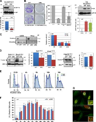 Arpp19Lox/Lox MEFs were transduced with GFP- (GFP) or GFP-Cre–expressing (CRE) adenoviruses, and GFP-positive cells were sorted by FACS. ARPP19 expression was evaluated by immunoprecipitation (IP) using the anti-NterARPP19 antibody at day 3 after viral transduction. Band intensity was quantified from six independent experiments. (B) Clonogenic assays using critical dilutions of GFP or Cre MEFs. Arpp19Δ/Δ MEFs were transiently transfected with HA-ARPP19 or the HA-ARPP19 S62A mutant. Cell colonies were counted and plotted as percentages relative to GFP cells. Values are from three different experiments. Expression of HA-ARPP19 and HA-ARPP19 S62A was confirmed by Western blotting. Band intensities measured from three different experiments. (C) HeLa and U2OS cells were transfected with scramble (CT) or with two different siRNAs against ENSA (siE1 and siE2) and processed for Western blotting. (D)