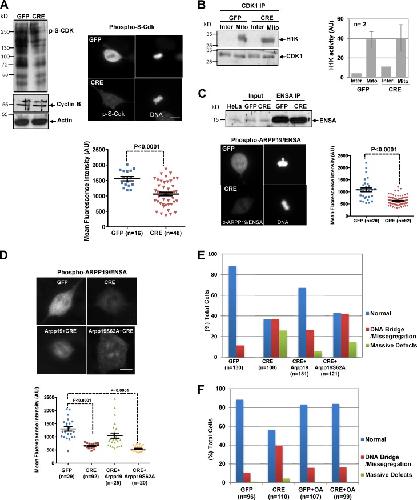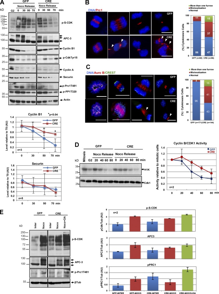 Figure 7. Arpp19 ablation promotes premature dephosphorylation of key cyclin B/CDK1 substrates and disrupts the temporal order of events of mitotic exit. (A) GFP- or GFP-Cre–treated MEFs were enriched in mitosis by nocodazole and isolated by shake-off. Cells were then released and collected at the indicated time points. Cell lysates were analyzed by Western blotting. Cyclin B1 and securin levels were quantified using ImageJ and are represented relative to the G2 levels. (B and C)