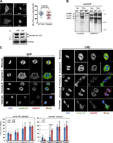 Figure 8. Arpp19 knockout perturbs the phosphorylation and localization of key nuclear envelope proteins. (A) GFP- or GFP-Cre–expressing adenoviruses were enriched in mitotic cells using nocodazole and collected for Western blotting (lower panel) or processed for immunostaining (upper left panel). The phosphorylated lamin A/C at S22 signal was quantified (upper right panel). (B) GFP or Arpp19Δ/Δ MEFs were synchronized (Noco) or not (Inter) in mitosis, lysed, and processed for immunoprecipitation (IP) using the mAB414 antibody that recognizes NUP 358, 214, 153, and 52 (Hofemeister and O’Hare, 2008). IPs were evaluated by Western blotting, using the antibody against serine phosphorylation by CDK (to detect NUP phosphorylation) and mAb414 to measure NUP levels. (C) GFP- or GFP-Cre–transduced Arpp19Lox/Lox MEFs were analyzed by confocal microscopy using the mAB414 and anti-lamin A/C antibodies. Bar, 10 µm. Lamin A/C and NUP mean intensities during mitosis progression were measured using ImageJ. A line was drawn across the DNA mass on the DAPI channel and transposed to the lamin A/C (green) and NUPs (red) channels using the region of interest plug-in. A plot profile was then constructed, and NUP intensity was measured in two points on the profile located outside and at the surface of the DNA mass. The mean values of these two points were then used to calculate the percentage of nuclear NUPs relative to the total intensity. Lamin A/C intensities were calculated as for the NUP signals except that, because of the diffuse nuclear distribution of Lamin A/C, intensities were measured outside and inside the DNA mass. Lamin A/C and NUP intensity data (mean ± SD) are from 57 GFP- and 59 GFP-Cre–transduced MEFs from three different experiments.