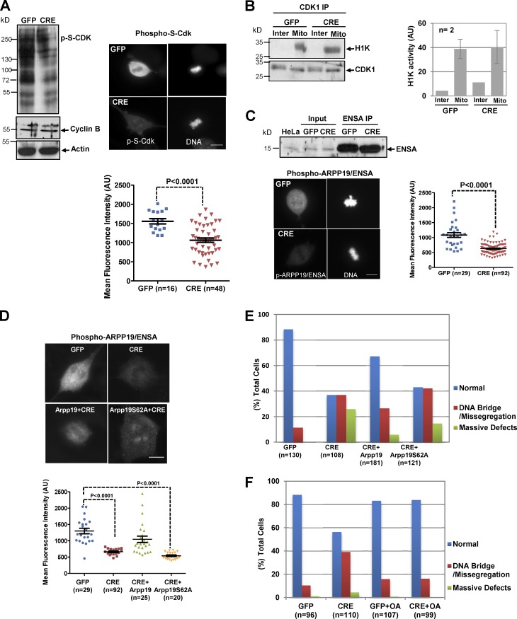 Figure 5. Arpp19 ablation phenotypes are rescued by inhibiting the PP2A phosphatase and by the ectopic expression of WT ARPP19, but not of the ARPP19S62A mutant. (A) GFP and CRE mitotic Arpp19Lox/Lox MEFs obtained by nocodazole shake-off were lysed and analyzed by Western blotting (left) with the indicated antibodies (p-S-CDK, antibody to detect phosphorylation on serine residues by CDK) or by immunofluorescence (right), and the total p-S-CDK immunofluorescence signal was quantified. (B) CDK1 activity was assessed by IP in the indicated mitotic MEF lysates followed by histone H1 phosphorylation. Total cell signal was quantified. (C) Top: ENSA protein levels were measured in GFP and CRE MEF lysates and ENSA IPs by Western blotting. Bottom left panel: ARPP19/ENSA phosphorylation at the GWL site was measured by immunofluorescence. Bottom right: Total immunofluorescence signal was measured in control and Arpp19Δ/Δ MEFs using ImageJ and is represented as the means ± SEM. (D) As for C, except that Arpp19Δ/Δ cells ectopically express HA-tagged WT human ARPP19 or the S62A mutant. (E) Quantification of the phenotypes observed in MEFs from D. Data pooled from two different experiments. (F) GFP or CRE MEFs were incubated with 5 nM OA and used for immunofluorescence. Phenotypes were counted and are represented. Bars, 10 µm.