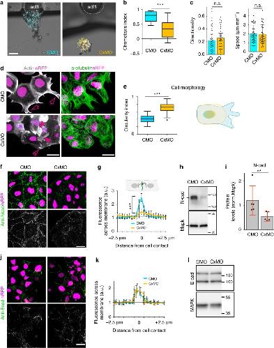 Fig. 1. Cx43 controls NC migration via N-cadherin regulation. a Neural crest chemotaxis towards SDF-1. Scale barâ=â100âμm. b Chemotaxis index (nCMO: 40, nCxMO:45 explants; Nâ=â3). c Directionality and velocity of stage 23 (st23) single neural crest cells. Neural crests were dissected and dissociated as described in Methods, followed by time-lapse imaging and tracking of individual cells (nCMO: 110, nCxMO: 115 cells, Nâ=â4), related to Supplementary Movie 1. d Neural crest cell morphology as visualized by life-actin-GFP (arrows mark normal and arrowheads irregular protrusions) and by immunostaining for α-tubulin. e Cell morphology quantification (nCMOâ=â58, nCxMOâ=â39, Nâ=â3) and diagram: control cell is shown in blue and Cx43 morphant in yellow. f N-cadherin (NCad) immunostaining of st23 neural crest. g Quantification of N-cad across the cell contact of st23 neural crest. N-cad levels, 0 represents contact point (nCTLMOâ=â25 and nCx43MOâ=â45 explants, Nâ=â3). h Western blot (WB) of st23 embryo lysates for N-cad and Mapk. i N-cad levels normalized to MAPK (nCMO: 156, nCxMO: 128 embryos, Nâ=â5). j E-cadherin (ECad) immunostaining of st23 neural crest. k Quantification of E-cad across the cell contact of st23 neural crest cells. E-cad levels, 0 represents contact point (n: 13 explants, Nâ=â3). Scale bars in d, f, and jâ=â20âμm. l WB of st23 embryo lysates for E-cad and Mapk. Box plots in b and e show the median, box edges represent the 25th and 75th percentiles, and whiskers show spread of data including outliers (Mann Whitney test p***â<â0.001) and histograms in c, i meanâ±âSE (two-tailed t test p**â<â0.01). Lines in g and k show mean and error bars represent SD (two-tailed t test p***â<â0.001). N number of independent experiments; n sample size. Spread of data in bar charts is shown as overlying dots. n.s. nonsignificant |