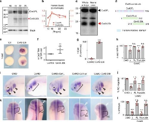 Fig. 4. Cx43 20âkDa isoform promotes N-cadherin expression. a WB showing Cx43 temporal expression. b Cx43 expression levels normalized to MAPK. Levels for Cx43 full length (Cx43FL) and Cx43-20k are plotted (nâ=â82 embryos, Nâ=â3). c Western blot against Cx43 using extracts from whole embryos (st21) and dissected neural crest (st21) (nwhole embryoâ=â20; nneural crestâ=â50 neural crests, Nâ=â3). d Diagram of Cx43 constructs used. e Blastula embryos analyzed by ISH for n-cad after the indicated treatments. Scale barâ=â70âμm. f qPCR for n-cad from blastula control embryos versus embryos expressing Cx53Tail (nControl: 89, nCx43-20k: 95 embryos, Nâ=â4) and g % of blastula embryos expressing N-cadherin mRNA analyzed by ISH (nControlâ=â62, nCx43-20kâ=â85 embryos, Nâ=â4). h qPCR for n-cad of st24 embryos (nfrom-left-to-rigthâ=â120, 118, 92, 86, 78, 92 embryos, Nâ=â4). i St24 embryos showing neural crest migration by ISH of twist; arrowheads: normal migration, brackets: impaired migration, asterisk: eye. j % of embryos with normal neural crest migration as analyzed by twist ISH of st24 embryos (nCMOâ=â115 and Nâ=â6, nCxMOâ=â116 and Nâ=â6, nCxMO+FLâ=â124 and Nâ=â5, nCxMO+Trunâ=â145 and Nâ=â4, nCxMO+Cx43-20kâ=â156 and Nâ=â5). k Dorsal view of St24 embryos analyzed for ISH of n-cad; arrows indicate injected side and black dotted area the neural crest. l % n-cad expressing embryos st24 (nCMOâ=â42 and Nâ=â6, nCxMOâ=â42 and Nâ=â6, nCxMO+FLâ=â13 and Nâ=â4, nCxMO+Trunâ=â15 and Nâ=â4, nCxMO+cx43-20kâ=â19 and Nâ=â4). Scale bars in i and kâ=â60âμm. Histograms in g, h, j, and l represent meanâ±âSE (one-way ANOVA pâ<â0.001; two-tailed t test p**â<â0.01, p*â<â0.05) n.s. nonsignificant. Dots in f show the spread of data and lines represent medianâ±âinterquartile (Mann Whitney test p**â<â0.01). N number of independent experiments; n sample size. Spread of data in bar charts is shown as overlying dots |