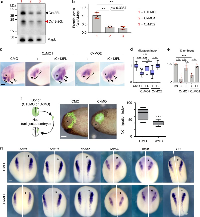 Fig. 3. Specificity of Cx43 MOs in neural crest cells. aâc Effect of two different antisense morpholinos against Cx43 (see Methods). a Western blot for Cx43 and α-tubulin, from st23 embryo lysates. b Cx43 levels were normalized to α-tubulin and plotted (Nâ=â3). c Analysis of neural crest migration by ISH for twist in st24 embryos, arrows show normal and brackets impaired migration. Co-injection of either of the MOs with human Cx43FL mRNA, which does not bind the MOs, but is highly conserved with Xenopus Cx43, showed a rescue in neural crest migration confirming the specificity of these treatments. d Neural crest migration index for each treatment. The length of each cephalic neural crest stream was measured in the injected (experimental) and uninjected (control) of the same embryo, and the migration index was defined as the ratio between experimental and control stream length. e % of embryos with normal neural crest migration in each treatment (nCMO: 89, nCxMO1: 78, nCxMO1+FL: 85, nCxMO2: 74, nCxMO2+FL: 95, Nâ=â4). Note that there is no significant difference between the phenotypes produced by the two morpholinos (n.s. in d and e). f CMO- or CxMO-NC transplanted into uninjected host embryos showing tissue-autonomous function. Migration index of st24 transplanted neural crest (nCMOâ=â35, nCxMOâ=â37, Nâ=â3). g St 16 embryos were analyzed by ISH for the early expression of neural crest markers sox9, sox10, snail2, foxD3, twist or C3, asterisk indicates the injected side (nCMOâ=â50; nCxMOâ=â50, Nâ=â3). Scale bar in c, f, and gâ=â50âμm. Histograms in b and e represent meanâ±âSE (one-way ANOVA pâ<â0.001, two-tailed t test p*â<â0.05, p**â<â0.01, p***â<â0.001). In d and f box plots show the median, box edges represent the 25th and 75th percentiles, and whiskers show spread of data including outliers (Mann Whitney test p***â<â0.001). N number of independent experiments; n sample size. Spread of data in bar charts is shown as overlying dots. n.s. nonsignificant |