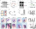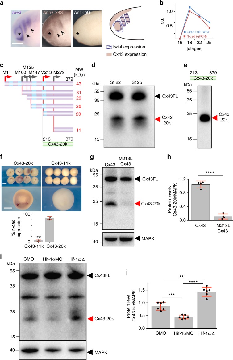 Fig. 5. Cx43-20âkDa isoform is generated from Internal Ribosome Entry Site (IRES). a twist ISH lcompared with Cx43 immunostaining in stage 24 embryos; IgG control antibody; arrow: neural crest; asterisk: eye. Drawing: Cx43 and twist expression summary. Scale barâ=â80âμm. b Cx43-20k protein levels (analyzed by WB) and N-cadherin mRNA (analyzed by qPCR) in st23 NC cells (nâ=â61 embryos, Nâ=â3). câh Cx43 putative IRES and activity of Cx43 isoforms. c Predicted methionine-initiated polypeptide. Green: constructs used in e. Red arrows: abundant peptides found in Xenopus; gray arrows: less abundant or absent peptides in Xenopus. d WB of embryos at NC migratory stages with antibody against the Cx43 C-terminus. Major bands correspond to Cx43FL and Cx43-20k (arrows). e WB of neural crest expressing the Cx43-20k-HA with an antibody against HA. The only band generated corresponds to the M276-initiated peptide (Cx43-20k). f Injection of Cx43-20k, but not Cx43-11k, leads to induction of N-cadherin expression in blastula embryos; percentage of embryos displaying N-cadherin expression, (nCx43-11kâ=â20 embryos nCx43-20kâ=â20 embryos, Nâ=â3). Scale barâ=â70âμm. g WB against Cx43 from embryos at st21 injected with Cx43-HA (lane 1) and with Cx43 mutated in methionine 213 (M213L Cx43, lane 2). h WBâs quantification (nlane1â=â20 embryos nlane2â=â20 embryos, Nâ=â4). i WB of st22 neural crest cells with antibody against the Cx43 C terminus. Lane1: control neural crest; lane 2: neural crest injected with Hif-1α morpholinos; lane 3: neural crest expressing a dominant active form of Hif-1α. j Quantification of Cx43 isoforms (ncontrolâ=â50; nHif-1αMOâ=â50; nHif-1αÎâ=â50 neural crests, Nâ=â6 independent experiments). Hif-1αMO and Hif-1αΠwere previously validated25. In f, h, and j histograms represent mean and bars show s.e.m. (in j one-way ANOVA pâ<â0.001, two-tailed t test, p**â<â0.01, p***â<â0.001, p****â<â0.0001). N number of independent experiments; n sample size. Spread of data in bar charts is shown as overlying dots |