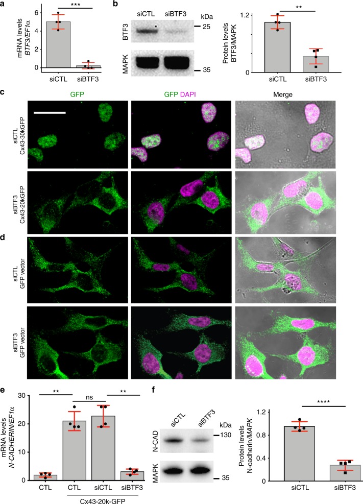 Fig. 9. Nuclear localization of Cx43-20k and N-cad expression is BTF3 dependent in HeLa cells. a, b siRNA efficiency. HeLa cells were transfected with siRNA control (siCTL) and siRNA against BTF3 (siBTF3). siBTF3 leads to an efficient reduction in Btf3 mRNA as analyzed by qPCR (a) (Nâ=â4) and BTF3 protein as analyzed by western blot (b) (Nâ=â4). c, d Cx43-20k nuclear localization. c siBTF3 leads to a strong reduction in Cx43-20k nuclear localization, compared with siCTL (Nâ=â3). d No difference between siCTL and siBTF3 was observed in cells transfected with a control GFP vector (Nâ=â3). Scale barâ=â20âμm. e, f N-cadherin expression. siBTF3 leads to a strong reduction of the n-cadherin mRNA (Nâ=â4) (e) and protein levels (Nâ=â4) (f) induced by Cx43-20k-GFP, as indicated by qPCR and western blot analyses. Histograms in a, b, e, and f represent meanâ±âS.E. (one-way ANOVA for e p***â<â0.001, two-tailed t- test p**â<â0.01, p***â<â0.001, p****â<â0.0001). N number of independent experiments; n sample size. Spread of data in bar charts is shown as overlying dots. n.s. nonsignificant |