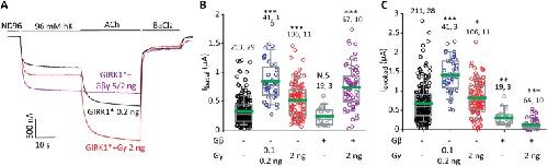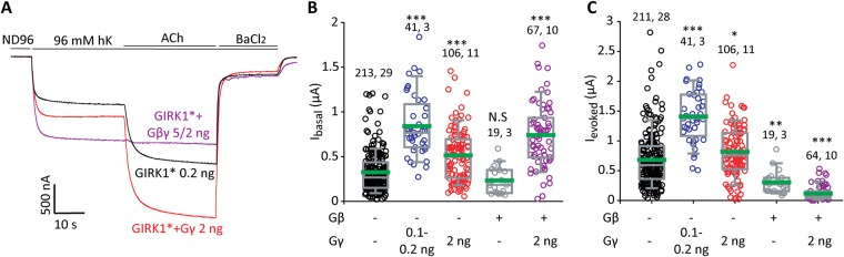 Figure 2. The effect of Gγ is different from the effect of coexpression of Gβγ. (A) Representative currents in oocytes injected with the indicated concentrations of RNAs: GIRK1*, GIRK1* with Gγ, and GIRK1* with Gβγ. m2R was coexpressed in all cases. Gγ enhances both Ibasal and Ievoked, whereas Gβγ enhances Ibasal but abolishes Ievoked. (B,C) Summary of the effects of expression of Gβ, Gγ and Gβγ on Ibasal and on Ievoked, respectively, of GIRK1*. The RNA concentration of GIRK1* was 0.2 ng/oocyte, RNA concentrations of Gβ and Gγ are indicated below the X axis. Data with 0.1 and 0.2 ng Gγ RNA were pulled because they produced very similar effects. The green line within the boxes shows the mean of data. Numbers at the top are n, N (number of cells, number of experiments). Statistical analysis: one-way ANOVA on ranks followed by Dunn’s test. *p < 0.05, **p < 0.01, ***p < 0.001, N.S = not significant, relative to GIRK1* alone. |