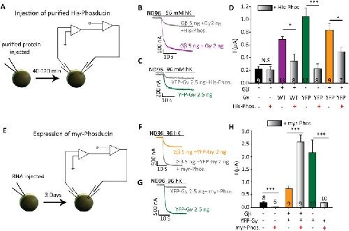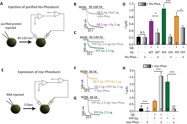 Figure 4. Activation of GIRK1* by Gγ requires ambient Gβ. (A–D) Injection of purified His-phosducin (His-Phos) inhibits activation of GIRK1* by Gγ. (A) Scheme of the experiment. At the day of the experiment, His-phosducin protein was injected into the oocytes to a final concentration of ~23 µM. After 40–50 min, currents were measured using the standard protocol. (B,C) Examples of GIRK1* currents. Oocytes were injected with GIRK1* 0.2 ng RNA/oocyte, Gβ 5 ng, YFP-Gγ 2.5 ng or Gγ 2 ng. Numbers of cells tested (n) are shown within bars; N = 1 experiment. (D) Summary of the experiment; His-phosducin significantly attenuates activation by Gγ and Gβγ. In this experiment, net GIRK current was calculated by subtracting average inward current measured in naïve oocytes in hK solution. Statistical analysis: t-test for each pair, with and without His-phosducin. *p < 0.05, **p < 0.01, N.S - not statistically significant. (E–H) Coexpression of myr-phosducin abolishes activation of GIRK1* by YFP-Gγ. (E) Scheme of the experiment. Myr-phosducin RNA (5 ng) was injected into the oocytes three days before the experiment, together with GIRK1* (0.2 ng RNA) and other indicated RNAs. (F,G) Examples of GIRK1* currents. (H) Summary of the results. Expression of myr-phosducin blocked the activation by YFP-Gγ but, apparently paradoxically, enhanced activation caused by Gβγ. Numbers of cells tested (n) are shown; N = 1 experiment. Statistical analysis was performed by using t-test for each pair, with and without myr-phosducin, ***p < 0.001. |