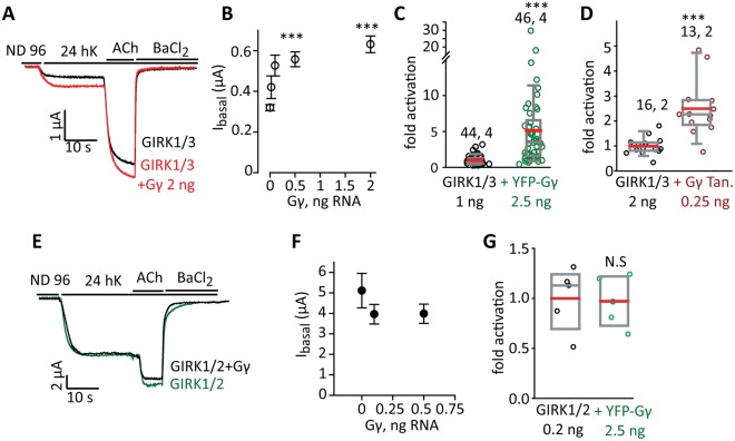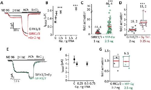 Figure 7. Gγ activates GIRK1/3 but not GIRK1/2. (A,B) Dose dependent activation of GIRK1/3 (1 ng RNA of each subunit) by Gγ (0.025-2 ng RNA). (A) Shows representative currents and (B) shows the full result of the experiment. n = 14 oocytes with each dose of Gγ. Statistics: one-way ANOVA followed by Dunnett’s test. ***p < 0.001 vs. GIRK1/3 alone. (C,D) Summary of effects of YFP-Gγ and Gγ tandem (Gγ Tan) on GIRK1/3. Numbers above data sets are n, N (number of cells, number of experiments). Statistics: t-test. (E,F) GIRK1/2 is not activated by Gγ. Measurements were done in the same experiment as in A,B; the effect of Gγ on GIRK1/3 served as positive control. GIRK1/2 (0.05 ng RNA of each subunit) was coexpressed without or with two RNA doses of Gγ, 0.1 or 0.5 ng. (E) Shows representative currents and (F) the full result of the experiment (5–9 cells in each group; N = 1). There was no significant difference between the groups. (G) YFP-Gγ does not activate GIRK1/2. There was no significant difference between the groups (n = 5, N = 1). |