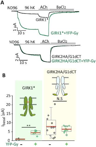 Figure 9. Addition of G1-dCT to GIRK2 does not confer Gγ sensitivity. (A) Representative traces of GIRK1* (top) or GIRK2HA/G1-dCT (bottom), expressed alone (0.2 ng RNA) or with YFP-Gγ (2.5 ng RNA). (B) Summary of the effect of YFP-Gγ on Ibasal. YFP-Gγ activates GIRK1* but not GIRK2HA/G1-dCT. GIRK1*: n = 6, chimera alone: n = 12, chimera with YFP-Gγ: n = 10, N = 1. **, p < 0.01, N.S. - not statistically significant (t-test for each construct with and without YFP-Gγ). |
