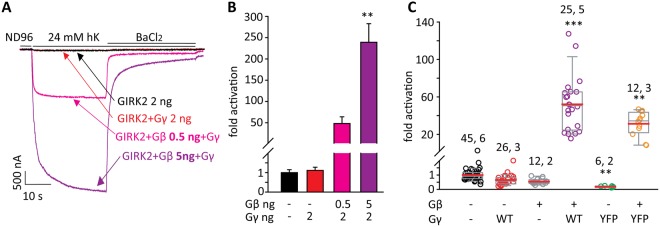 Figure 6. Gγ does not activate GIRK2. (A) Representative currents of GIRK2 (2 ng RNA) with two different concentrations of Gβ RNA and a fixed concentration of Gγ RNA, 2 ng/oocyte. (B) Summary the representative experiment shown in A, showing fold activation by Gγ or Gβγ in each group. One-way ANOVA followed by Dunn’s test. *, p < 0.05 relative to GIRK2 alone. n = 5–6 cells in each group; N = 1. (C) Summary of effects of Gβ, Gβγ, Gγ and YFP-Gγ from this series of experiments. RNA doses, in ng/oocyte, were: GIRK2, 2; Gγ, 1 or 2; Gβ, 5; YFP-Gγ, 2.5. Numbers above data sets are n, N (number of cells, number of experiments). Statistical analysis: one-way ANOVA followed by Dunn’s test. **p < 0.01, ***p < 0.001 relative to GIRK2 alone. |