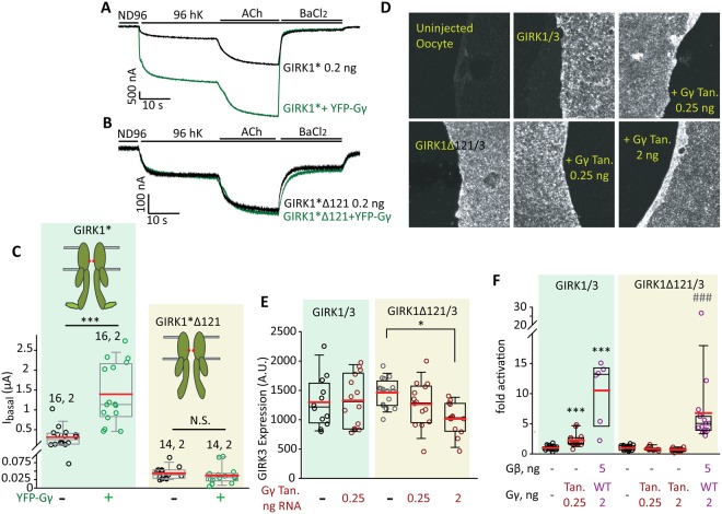 Figure 8. Distal C-terminus of GIRK1 is important for Gγ activation of GIRK1* and GIRK1/3. (AâC) Deletion of dCT abolishes the activating effect of YFP-Gγ (2.5âng RNA) on GIRK1*. (A,B) show representative traces of GIRK1* (A) and GIRK1*Î121 (B) expressed alone or with YFP-Gγ. m2R was expressed in all cases. (C) Summary of the experiment. Numbers above data sets are n, N. Statistics: t-test for each pair with and without YFP-Gγ. ***pâ<â0.001, N.S., not statistically significant. (DâF) Expression of Gγ tandem (Gγ Tan) does not affect the expression of GIRK1/3 in the PM (D,E) and activates GIRK1/3 but not GIRK1Î121/3 (GIRK1Î121/3; F). Oocytes were stained with an antibody against GIRK3. Representative images of giant excised PM patches are shown in (D) and summary of measurements in (E) Gγ tandem did not affect the expression of GIRK1/3, but reduced the expression of GIRK1Î121/3 when expressed at a high dose (pâ<â0.05 for 2âng Gγ tandem). A.U., arbitrary units. nâ=â12â16 membranes in each group, Nâ=â1. (F) Summary of the effects of Gγ tandem and of Gβγ on Ibasal. nâ=â10â15 cells in each group, Nâ=â2. Gγ tandem and Gβγ significantly increased Ibasal of GIRK1/3 (***pââ¤â0.001 vs. GIRK1/3 alone). GIRK1Î121/3 was not affected by Gγ tandem but was activated by Gβγ (###pâ<â0.001 vs. GIRK1Î121/3 alone). |