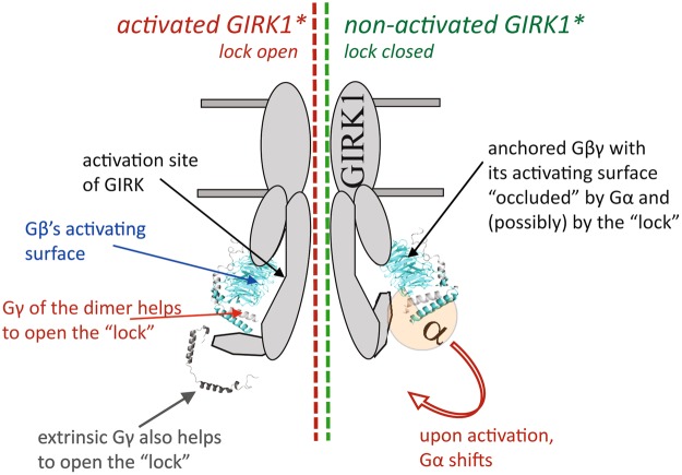 Figure 10. A hypothetical scheme of regulation of a GIRK channel containing the GIRK1 subunit by Gγ. In GIRK1-containing channels, Gβγ or the Gαβγ heterotrimer (shown in the figure) may be anchored to GIRK. In the resting state, the interaction surface of Gβ is occluded by Gα and cannot contact the activation site of GIRK. Lock element (encompassing the G1-dCT and other unknown parts of the channel) is closed, reducing channel activity. Upon activation by agonist, the GPCR (not shown) activates the G protein causing dissociation of Gα from Gβγ, exposing the GIRK-interacting surface of Gβ. Gβγ may now bind to the activation site. We propose that, at the same time, Gγ interacts with a channel’s element and helps to release the inhibitory effect of the “lock”. Exogenous Gγ may mimic this action without activating the channel by itself, but only if Gβγ is present. |