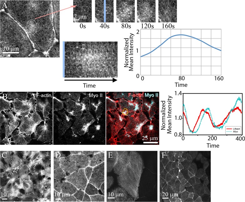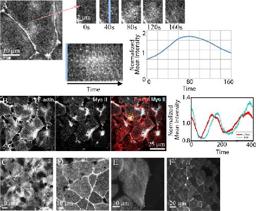 Fig 1. Kinetics and diverse morphology of actomyosin contractions in Xenopus laevis embryos.(A) Punctuated F-actin contractions, or "actin-asters" are observed the apical cortex of Xenopus neural epithelial cells during gastrulation. F-actin is seen across the apical surface and cell-cell junctions but is transiently enriched during a contraction (circle). A series of frames from a time-lapse sequence (arrow) reveals rapid accumulation and dissipation of F-actin in the apical cortex. A kymograph of the contraction (across blue line) shows the changing intensity of F-actin and quantified as changes in normalized intensity (Icontraction/Icell) over length of the time lapse. Normalized intensity is based on identifying a region of interest (ROI) and tracking the intensity with that ROI over time. (B) Frames from a time-lapse series where F-actin (mChe-life-act) and mini-thick filaments of active myosin II (MyoII; mNeon-sf9, [22]) can be tracked in the basal cell cortex. Temporal analysis reveals that myosin co-localizes with F-actin asters but lags both accumulation and dissociation profiles of F-actin. (C) Similar spatial and temporal patterns of F-actin are evident on the basal surface of a Xenopus animal cap explant cultured on fibronectin coated glass, (D) the apical surface of an animal cap explant cultured against a clean glass surface, (E) the apical surface of the blastopore lip (confocal image provided by Joseph Shawky and Rafey Feroze, personal communication, March 2014), and (F) across a broad field of cells of the neural epithelium (confocal image provided by Deepthi Vijayraghavan, personal communication, June 2017). |