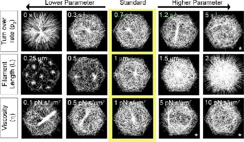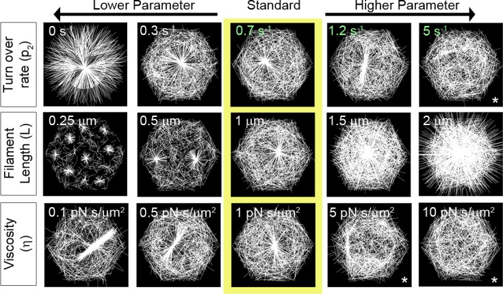 Fig 4. Diverse actomyosin arrays can be formed by discrete changes in filament dynamics.Steady state F-actin morphology after 10 s as F-actin biophysics is altered. Arrays from different simulations in the center column (yellow box) are formed by a standard set of parameters. Each row depicts arrays formed when a single parameter regulating F-actin is changed. Arrays formed from simulations are shown in each column and are ordered from lower (left) to higher parameter values (right). Only the parameter described by row and column were varied, the other parameter values were held at the standard value. See S1 Table for the details of parameters used here. We have included an asterisk (*) to note cases where an aster has not formed. To determine if an aster could form over longer times, we ran these simulations for a more extended duration and found only minor changes in the asters (S5 Fig). |