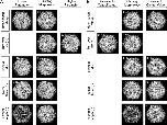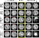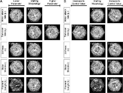 Fig 6. Changing conditions that destabilize or rescue aster formation.(A) To determine whether asters could be destabilized we ran simulations where conditions that produced stable asters were changed to conditions that did not. Conditions for simulations forming quasi-stable asters after 1,000 time steps (center) were changed and the network was followed for 1,000 additional time steps (left or right column). Stable asters are resistant to disruption under most changes except when rates of filament turn-over are increased or when motor attachment rates are reduced. (B) To determine whether asters could be rescued from non-steady states we ran simulations starting with conditions that did not produce stable asters or produced multiple asters before switching to conditions that only formed single asters from initially disorganized networks. Parameters producing the starting morphology after 1,000 time steps are listed in the center columns while the altered parameters are listed in the right (lower) or left (higher) columns. Single aster morphologies could be rescued by changes in motor properties of stiffness or stretch length but could not be rescued by changes in filament length. In all cases the morphology of filament arrays remodeled after 2,000 time steps are shown either under the âLower Parameterâ or âHigher Parameterâ columns. |