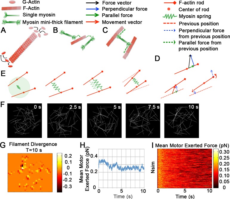 Fig 2. Dynamic model of filaments and motors in two dimensions.(AâE) Schematic depicting the biophysical interactions and dynamics of F-actin and myosin II motors. A) G-actin monomer extends the plus- or barbed-end of the actin filament through polymerization and disassembles the filament at the minus end. Our simulation does not explicitly implement polymerization or depolymerization dynamics but rather captures the impact of those processes through a single turn-over rate, i.e. one filament completely depolymerizes and a new one polymerizes at a new random location. (B) Individual non-muscle myosin II motors bundle together into a multi-headed mini thick filament and when activated bind to F-actin, or when inactivated detach from F-actin. Our simulation does not explicitly implement motor assembly, activation, or inactivation. Instead, our model motors represent non-muscle myosin II already bundled into activated myosin filaments. (C) Once bound, myosin filaments 'walk' to the plus-end of the F-actin. (D) Vector diagram of force generated by a single motor attached to a filament. The filament bound by the motor moves in 2D as vector forces at the attachment point are decomposed into parallel and perpendicular forces which are opposed by viscous drag. The perpendicular force (blue) leads to a perpendicular translation and torque applied to the ends drive filament rotation; forces applied parallel to the filament drive translational movement. (E) Schematic showing filament movements after a searching motor binds a pair of filaments: after the motor binds a pair of filaments each head domain moves at a fixed velocity toward the bound filament's plus-end. After one time step, the motor exerts a force couple on the filament pair, rotating and pulling the filaments together. Repeated applications of such directed forces result in polarity sorting of filaments that may have initially been anti-parallel. (F) A sparse network of 50 filaments (white) and 250 motors (not shown) illustrates filament movements over 1,000 time steps or 10 seconds. (G) Filament divergence, a measure of aster assembly, reveals a single aster at point of transition from low to high divergence. (H) The mean motor exerted force (blue; pN) over 1,000 time steps or 10 seconds. (I) The time-evolution of mean motor exerted force for 100 simulations, each initiated with randomly positioned filaments and motors. |