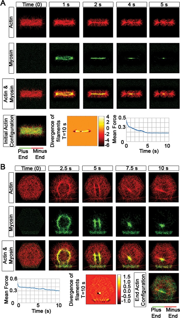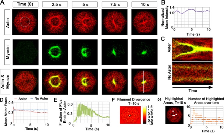 Fig 3. Actomyosin arrays remodel in simulated dense networks.(A) Sequence of images from a simulated time lapse of 1,000 actin filaments (red) and 5,000 myosin motors (green). (B) The normalized actin mean intensity (purple) within a region in A (circle at 0 s). The mean intensity is based on identifying the location of an aster within a region of interest (ROI; in this case a circle), and tracking the intensity in that ROI over time. (C) Kymograph at top show formation of an aster over 10 seconds (line in A at 10 s). Kymograph below shows a case where the filament turnover rate is high (p2, 5/s) and no asters are formed. (D) The mean motor exerted force quickly peaks and subsides in cases where asters form (pN, red) but remain constants for cases where no asters form (blue). We have compared the mean motor force for 10 simulations with the standard parameter set and observe that the profiles are similar (S2 Fig) (E) The 'connectedness' of filament plus-ends shown over the length of simulation. (F) The divergence of filaments at the conclusion of a simulation generating an aster; high divergence (yellow region in the center) indicates where filament polarity reverses. (G) Our coarse-grained image analysis technique shows highlighted hexagonal areas within the larger domain at 10 s (S4 Video). We quantified the number of the highlighted areas over time (orange). Additional calculations, including a comparison between the image analysis of filament intensity mappings versus divergence mappings are in the supplementary material (S3 Fig). |