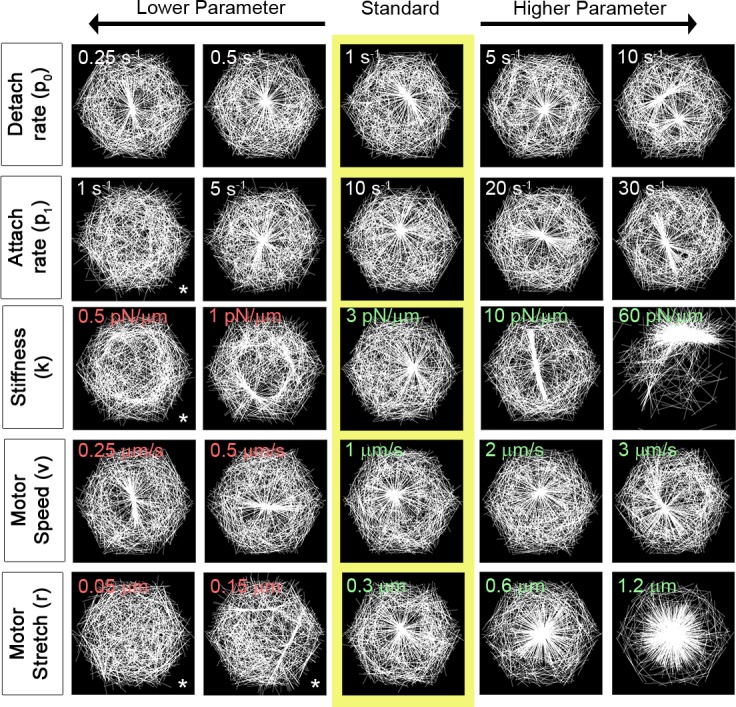 Fig 5. Diverse actomyosin arrays can be formed by discrete changes in motors dynamics.Steady state F-actin morphology after 10 time steps as myosin II biophysics is altered. The yellow box indicates the same set of standard parameters but random initial configuration. Each row depicts morphology generated by changes in a single parameter controlling myosin II motors, ordered from lower value on the left to higher value on the right. Each simulation starts with randomly oriented and positioned filaments and motors. Red numbers represent values outside of the physiological determined range, green numbers are values within physiological range, and white represent numbers whose ranges are best guess values. Rates of motor attachment (p1) and detachment (p0) are estimated. See S1 Table for additional parameters. We have included an asterisk (*) to note cases where an aster has not formed. To determine if an aster could form if given enough time, we ran these simulations for longer time and present results in S5 Fig. |