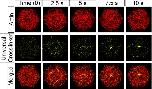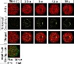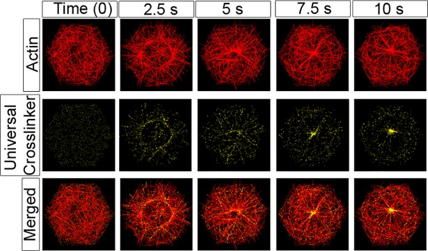 Fig 8. Generic actin cross-linkers slow but do not prevent aster formation.Time-evolution of filaments (red), actin cross-linkers (yellow; 1,250) and motors (3,750, not shown) show cross linkers do not inhibit formation of asters. Cross-linkers bind at the same rate as motors (p0) to filament pairs that are oriented within 22.5° (π/8) of each other and no more than 40 nm apart. The cross linkers bind to the shortest distance between candidate filament pairs, and remain fixed. The merged images in the bottom row show the formation of an aster over the time course. Biophysical parameters guiding filaments and motors in these simulations are the standard set (see S1 Table for details). |