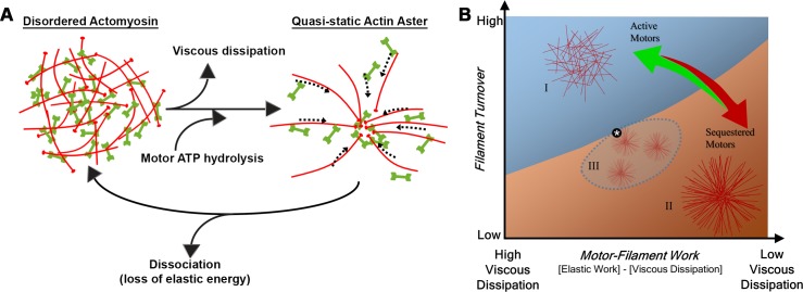 Fig 10. Qualitative maps of phase transitions in actomyosin arrays.(a) Proposed model for how disordered actomyosin arrays transition to quasi-static actin asters. Viscous dissipation leaves the system as motor ATP hydrolysis generates reorganization of the actin network. For a quasi-static actin aster to revert back to a disordered state, we believe there is a dissociation of the network resulting from a loss of elastic energy. (b) Phase transitions in parametric space are determined by physical principles of work energy of a dissipative system of filaments, motors, and their viscous environment. For instance, high rates of force production lead to greater losses to viscous dissipation and less contribution to elastic remodeling of the filament array. Aster morphologies (region II) can emerge from disordered arrays (region I) via several mechanisms including reduced filament turnover, reduction of viscous losses, or increased motor-work. In special cases where filaments are shortened (dashed domain, region III) multiple asters can form. Multiple asters are also sensitive to work energy and can merge into single asters (transition to region II) or disperse into disordered arrays (transition to region I) under similar conditions that mediate aster/no aster transitions. The asterisk indicates the location of our ‘standard’ parameter set leading to a single robust aster. |