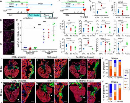 Fig. 5. Short exposure or TH deprivation prior tadpole heart amputation alters extracellular matrix components and not DNA synthesis following injury. (A) Control nontreated and tadpoles either T3-treated or perchlorate-treated were amputated at day 0 and followed the same EdU protocol, as in Fig. 3. Ventricles were analyzed at 14 dpa. (BâE) Mef2+ and Mef2+/EdU+ nuclei quantification was performed for nontreated (B, CTRL), T3-treated (C, T3), and perchlorate-treated (D, Perchlo), for nonamputated (NON AMP) and amputated (AMP) hearts, and the ratio (%) Mef2+EdU+/Mef2+ given for each condition (E). Samples were obtained from three independent experiments. n ⥠3 per group and >3 sections were quantified per sample, and graph represented as mean with SEM. One-way ANOVA followed by Sidakâs multicomparisons test was performed (*P < 0.05; ***P < 0.001). (F) Control untreated, T3-treated, and perchlorate-treated tadpoles were collected at day 0 without amputation and ECM gene expression was quantified. (G) The TH-responsive gene thibz was a positive control, showing a strong induction of its expression in heart treated with T3. (H) The expression of cardiac ECM genes col1a1, fapα, mmp2, mmp9, mmp11, mmp13, and mmp14 showed a differential regulation in T3-treated and perchlorate-treated hearts, excepted tnc and fn1, compared with control hearts. Samples were obtained from >3 independent experiments (CTRL, n = 8; T3, n = 8; Perchlo, n = 6). Fold-change (FC) is shown in log2 scale, respective to CTRL. Data are represented as an aligned dot plot showing median with interquartile range. For normally distributed values (thibz, fn1, col1a1, tnc, mmp1, mmp2, mmp11), a one-way ANOVA followed by Sidakâs multiple comparisons test was performed. For not normal distributions (fapα, mmp9, mmp13, mmp14) a nonparametric KruskalâWallis test followed by a Dunnâs multiple comparisons test was performed. (ns, nonsignificant, P > 0.05; *P < 0.05; **P < 0.01; ***P < 0.001; ****P < 0.0001). (IâP) Impact of pharmacological treatments on TnC presence at the site of amputation at 30 dpa (IâL) and 90 dpa (MâP). Representative images are shown for CTRL untreated, T3-treated, and perchlorate-treated tadpoles as well as a quantification of the staining intensity for TnC with the following color scheme: Absence (â, dark blue), slight staining at the ventricle surface (â/+, blue), weak (+, light orange), average (++, medium orange), and strong presence (+++, dark orange). Arrowheads (IâO) indicate the site of amputation, magnified in (Iâ²âOâ²). Data were obtained from more than three independent experiments: 30 dpa, n = 16 (CTRL), n = 12 (T3), and n = 16 (Perchlo); 90 dpa, n = 11 (CTRL), n = 8 (T3), and n = 11 (Perchlo). [Scale bars: 100 μm (BâD) 200 μm (I, J, K, M, N, and O) and 50 μm (Iâ², Jâ², Kâ², Mâ², Nâ², and Oâ²).] |