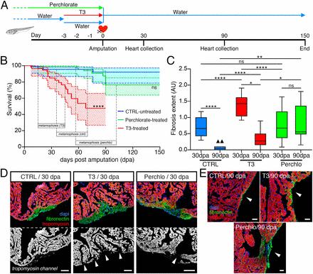 Fig. 4. Short TH exposure or deprivation before tadpole heart amputation hinders the regenerative capacity. (A) A ventricular resection was performed on tadpoles following a 3-d TH-pretreatment (T3, 10â10 M) or treated with the goitrogen perchlorate for more than 2 mo. Hearts were analyzed at 30, 90, and 150 dpa and compared with nontreated amputated tadpoles as a control (CTRL). (B) Survival curves for all groups. Significantly increased mortality was observed for T3-treated tadpoles compared with CTRL following amputation, whereas no significant difference in survival up to 150 dpa was seen with perchlorate-treated tadpoles. The time period corresponding to the metamorphosis of the experimented tadpoles are indicated. (C) Fibrosis extent drastically diminished between 30 and 90 dpa in CTRL, but remained significantly present for both T3-treated and perchlorate-treated tadpoles at 90 dpa. (D) Representative immunolabelings for cardiomyocytes (tropomyosin, red), fibrous tissue (fibronectin, green), and nuclei (DAPI, blue) focusing on the cardiac amputation site for untreated CTRL, T3-treated, and perchlorate-treated tadpoles at 30 dpa. Black and white pictures showing only the tropomyosin channel are shown for each heart, facilitating myocardial wall continuity assessment. No gaps in the myocardial wall were observed for CTRL ventricles at 30 dpa, whereas the ventricles of T3-treated and perchlorate-treated tadpoles presented an evident absence of myocardium closure, with numerous gaps observed in the myocardial wall at the amputated site for the T3-treated heart (white arrowheads). (E) Immunolabeling for tropomyosin (red), fibronectin (green), and DAPI-labeled nuclei (blue) showed that compared with untreated CTRL, an invasive fibrotic zone remained detectable at the amputation site at 90 dpa in T3-treated tadpoles and perchlorate-treated tadpoles (arrowheads indicate the amputation site). All data were obtained from more than three independent experiments. n = 74 (CTRL), n = 58 (T3), and n = 47 (Perchlo) and a log-rank (MantelâCox) test was used to compare survival curves (ns, nonsignificant, P > 0.05; ****P < 0.0001). For fibrosis extent and fibronectin immunolabeling: 30 dpa, n = 16 (CTRL), n = 12 (T3), and n = 16 (Perchlo); 90 dpa, n = 11 (CTRL), n = 8 (T3), and n = 11 (Perchlo), and graph represented as box plot showing median with interquartile range. A nonparametric MannâWhitney test was performed for fibrosis extent comparison (ns, nonsignificant, P > 0.05; *P < 0.05; **P < 0.01; ****P < 0.0001). (Scale bars, 100 μm in D and 50 μm in E.) |