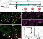 Fig. 1. Transient fibrotic response followed by complete ventricle rebuilding after cardiac resection in tadpole heart. (Top) Cardiac resection was performed on prometamorphic NF57 X. laevis tadpoles by dissecting the abdominal skin and opening the pericardium, then removing â¼10â15% of the ventricle toward the apex. Hearts were collected at 1, 3, 14, 30, 50, 90, and 180 dpa. (AâG) PSR histological labeling reveals an intensification of fibrotic connective tissue up to 14 dpa at the site of amputation (labeled in dark red). From 30 dpa up to 90 dpa, the fibrotic zone regressed and progressively disappeared as the ventricle apex regained a normal morphology, and was strongly reduced or undetectable after 90 (F2 and F1, respectively) or 180 dpa (G). (Aâ²âGâ²) Higher magnifications, with dotted lines indicating amputated area and arrows indicating the amputation site. (Scale bars, 100 μm.) |