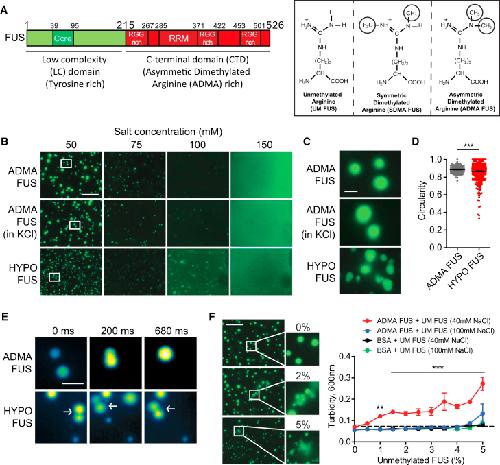 Figure 1. Phase Separation of Full-Length FUS at Physiological Temperature and Protein Concentration Is Modulated by Salt Concentration and Arginine Methylation(A) Left: Schematic of domain architecture and location of tyrosine-rich and arginine-rich domains. Right: Arginine methylation species. RRM, RNA recognition motif; RRG, arginine glycine-rich domain.(B) Salt-dependent phase separation of ADMA FUS and HYPO FUS. Top: Representative images of phase separation of 1 μM EmGFP-tagged ADMA FUS in 50â150 mM NaCl. At 150 mM NaCl, ADMA FUS is mono-dispersed, but phase separates into spherical droplets at lower salt concentrations. Middle: Representative images of ADMA FUS for KCl concentrations of 50â150 mM. Bottom: Identically prepared HYPO FUS phase separates at higher salt concentrations (100 mM) into small, irregularly shaped condensates. White boxes indicate location of magnified images in (C). Scale bar, 25 μm.(C) High-magnification images of condensates from (B). Scale bar, 5 μm.(D) Quantitative analysis of sphericity: ADMA FUS condensates (gray) in 50 mM NaCl are spherical. HYPO FUS condensates (red) are less spherical (t = 3.47, p = 0.0006). n ⥠121 particles/FUS subtype; n > 3 independent replications. Error bars, SEM.(E) Sequential structured illumination microscopy images of individual droplet collisions at 0, 200, and 680 ms. ADMA FUS (top) fuse. HYPO FUS collide but do not fuse. Scale bar, 2 μm. See Video S1 (ADMA FUS) and Video S2 (HYPO FUS).(F) Representative images and quantitative turbidity graphs of phase separation arising from mixing EmGFP-tagged ADMA FUS with the indicated percentage of fully unmethylated UM FUS. Preparations containing > 1% UM FUS form small non-spherical, non-fusing, and amorphous assemblies. Scale bar, 25 μm. Two-way ANOVA with Bonferroni post hoc test versus ADMA FUS at 40 mM, n ⥠3 replications, ââp < 0.01, âââp < 0.001. Error bars, SEM.See also Figure S1 and Videos S1 and S2. |