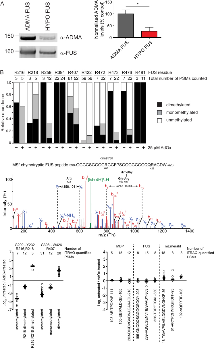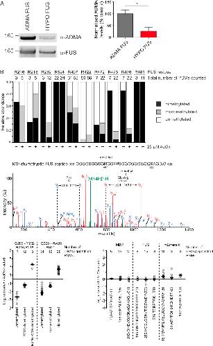 Figure S1. 25 μM AdOx Treatment Significantly Reduces Asymmetric Dimethylation of FUS Purified from Sf9 Cells, Related to Figure 1(A) Left: Representative western blot of MBP-FUS-EmGFP protein purified from Sf9 cells after 4 days of 25μM AdOx, or DMSO control. Right: Quantification of western blots. n = 4 per experimental group, one-tailed, Mann-Whitney U test, âp ⤠0.05, error bars = SEM.(B) Top: FUS dimethylation sites differ in their apparent susceptibility to AdOx treatment. Depicted are the relative proportion of peptide-to-spectrum matches (CID MS2 spectra of unlabeled peptides identified with the PEAKS algorithm) comprising a given FUS arginine residue observed in an unmodified, mono- or dimethylated state. For most FUS arginine residues, methylation decreased in AdOx treated relative to mock treated cells, except for R394 and R481 which were consistently observed to be dimethylated. Middle: Orbitrap CID MS2 spectrum of a chymotryptic FUS peptide dimethylated at R407 identified with confidence exceeding 99%. The other arginine residue present (R422) was unmodified, as evidenced by a continuous y-ion series indicating no post-translational modification in this part of the peptide. The spectrum is representative of 77 peptide-to-spectrum matches for this region of FUS, which consistently identified (mono or di) methylated R407 accompanied by unmodified R422. Bottom left: Evidence for AdOx-dependent inhibition of arginine methylation. The graph depicts the relative ratios of unmethylated, monomethylated and dimethylated versions of the FUS peptides 209-GQQDRGGRGRGGSGGGGGGGGGGY-232 and 398-GGGGSGGGGRGGFPSGGGGGGGQQRAGDW-426 in untreated and AdOx-treated FUS preparations. Circles represent individual quantifications. The number of quantifications (based on separate peptide-to-spectrum matches) underlying each cumulative quantification are listed above the graph. Horizontal marks depict median Log2 ratios for a given peptide and modification. Bottom right: AdOx treatment did not affect overall abundance of peptides in untreated versus AdOx-treated samples. Abundance ratios of nine chymotryptic peptides from the MBP-FUS-EmGFP. All peptides depicted either lack arginine residues or contain arginine residues but were not observed to be methylated or dimethylated. |
