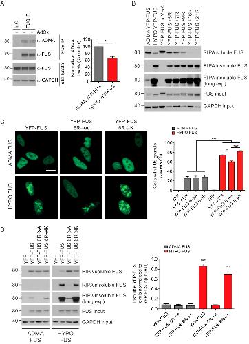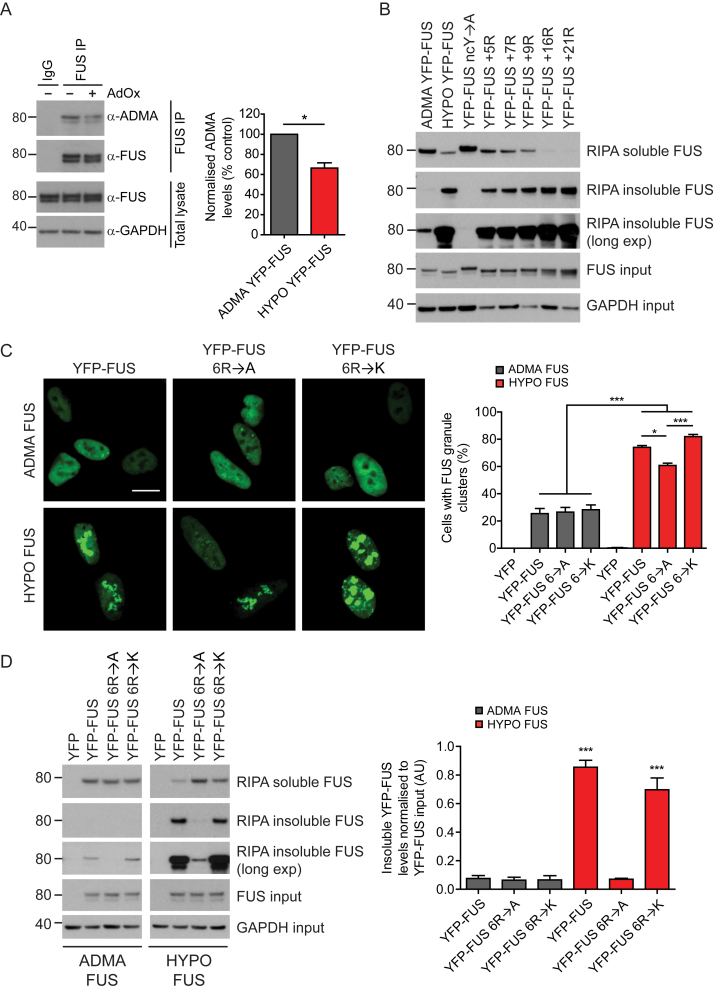 Figure S3. Substitution of Alanine for Six Arginines that Are Differentially Methylated Reduces FUS Aggregation Propensity after AdOx Treatment, whereas Lysine Substitution Still Supports FUS Aggregation Propensity, Related to Figure 3(A) AdOx treatment causes hypomethylation of YFP-FUS in SH-SY5Y cells. Representative image of a western blot of immunoprecipitation of YFP-FUS from SH-SY5Y cells showing a significant reduction in asymmetrically dimethylated arginine (ADMA) epitopes after AdOx treatment. Unpaired t test, n = 5, âp < 0.05, error bars = SEM.(B) Western blot analysis of RIPA soluble and insoluble FUS in SH-SY5Y cells expressing YFP-FUS with or without AdOx treatment (HYPO and ADMA FUS respectively), or mutant FUS including FUS with fewer tyrosine residues (ncYâA) or more arginine residues (quantified in Figure 3E). Cells were lysed directly into loading buffer to determine FUS input. Hypomethylation of FUS results in increased levels of insoluble FUS with a concomitant decrease in soluble FUS, as does increasing the number of arginine residues, in a dose-dependent manner. ADMA and ncYâA FUS are predominately soluble but a longer exposure shows that FUS ncYâA is more soluble compared to ADMA FUS.(C) Representative confocal images of SH-SY5Y cells expressing YFP-FUS with 6 arginine residues mutated to alanine (6RâA) or lysine (6RâK), with DMSO (ADMA FUS) or AdOx treatment (HYPO FUS), with quantification of the number of cells with nuclear granule clusters on the right. Scale bar = 10 μm. Number of cells counted > 100. One-way ANOVA with Tukey posthoc test, n = 3, âp < 0.05, âââp < 0.001, error = SEM.(D) Mutating the same 6 arginine residues to alanine (6RâA), but not lysine (6RâK), leads to reduced levels of AdOx induced (HYPO FUS) RIPA insoluble FUS compared to wild-type with quantification of the amounts of RIPA insoluble FUS on the right. One-way ANOVA with Tukey posthoc test, n = 4, âââp < 0.001, error = SEM. |