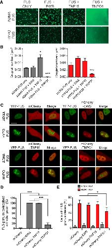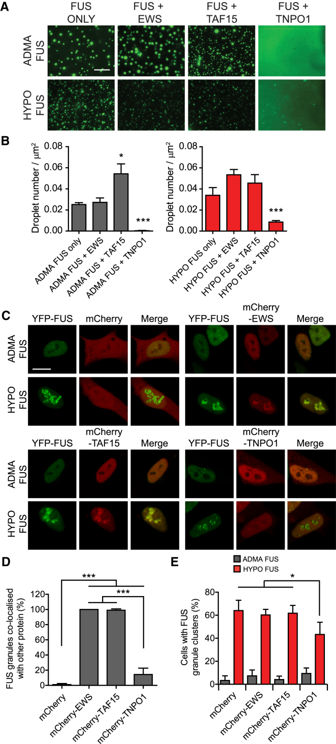 Figure 4. TNPO1 Is a Molecular Chaperone for ADMA FUS and HYPO FUS(A) Representative images of FUS phase separation in the presence of equimolar concentrations EWS, TAF15, or TNPO1. EWS and TAF15 had minimal impact on FUS phase separation. TNPO1 suppressed both ADMA FUS and HYPO FUS phase separation. Scale bar, 25 μm.(B) Quantification of (A). Kruskal-Wallis test, Dunnâs post hoc, n = 32â35 fields of view, âp < 0.05, âââp < 0.001. Error bars, SEM.(C) Representative images of FUS granules in AdOx-treated SH-SY5Y cells expressing YFP-FUS (green) and mCherry, mCherry-tagged EWS, mCherry-tagged TAF15, or mCherry-tagged TNPO1 (red). FUS granules co-localized with EWS and TAF15, but not with TNPO1 or mCherry alone. Scale bar, 10 μm, n = 8 replicates.(D) Quantification of (C): FUS co-localized with EWS (100% ± 0.0%) and TAF15 (99.1% ± 1.7%). FUS poorly colocalized with TNPO1 (14.3% ± 8.5%) or mCherry only (1.0% ± 1.4%). One-way ANOVA, Tukeyâs post hoc, n = 8 replicates, âââp < 0.001.(E) TNPO1 reduced the number of SH-SY5Y cells with AdOx-induced FUS granules. One-way ANOVA, Tukeyâs post hoc, n = 8 replicates, âp < 0.05.See also Figure S4. |