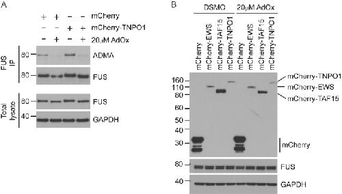 Figure S4. TNPO1 Expression Does Not Affect FUS Expression and Does Not Change Asymmetric Methylation Caused by AdOx Treatment, Related to Figure 4(A) FUS immunoprecipitation and western blot studies show that overexpression of mCherry-TNPO1 has no effect on total YFP-FUS expression or FUS methylation. Representative of n = 3.(B) mCherry western blotting studies show that AdOx treatment has no effect on TNPO1, EWS, TAF15 or FUS expression. Representative of n = 3. |