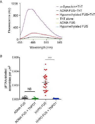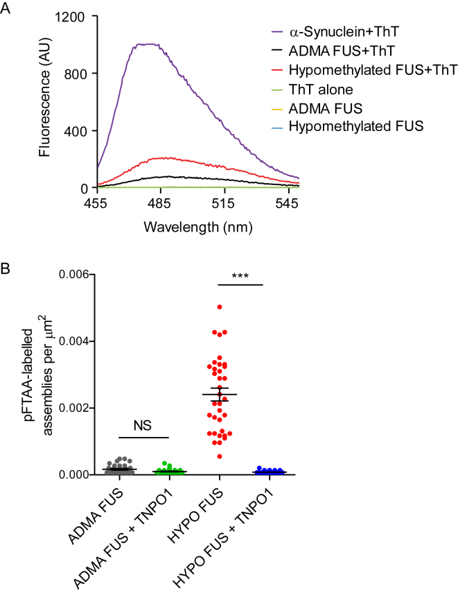 Figure S5. pFTAA Binds and Fluoresces with HYPO FUS but Not ADMA FUS, whereas ThT Only Binds and Fluoresces Very Weakly to HYPO FUS or ADMA FUS, Related to Figure 5(A) Phase-separated FUS assemblies only weakly bind ThT. Fluorescence spectroscopy reveals weak ThT binding to methylated FUS (black line) but stronger ThT binding to hypomethylated FUS (red line). No fluorescence was detected from methylated FUS (yellow line), hypomethylated FUS (blue line) or ThT alone (green line). ThT binding to α-synuclein generated > 5-fold greater fluorescence (purple line).(B) Phase-separated FUS assemblies bind pFTAA, especially hypomethylated FUS.Plot of pFTAA fluorescent assemblies perμm2 for either ADMA FUS or hypomethylated FUS with and without TNPO1. There is strong pFTAA fluorescence from hypomethylated FUS assemblies which is dramatically reduced in the presence of equimolar amounts of TNPO1. Kruskal-Wallis with Dunnâs post hoc, n > 40 droplets over 3 replications, âââp < 0.001, NS = not significant, error bars = SEM. |